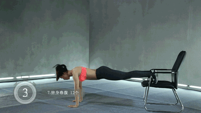 ▲俯身卷腹:雙腳放在椅子上,雙手平撐在地板上,呈俯臥撐的姿勢。讓臀部盡量抬高,然後回原狀態,12個後休息。