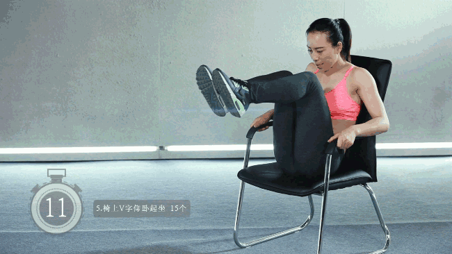 ▲椅上V字仰臥起坐:這個動作和上一動作稍微有點區別,看起來很像,但是在做這個動作的時候腿部動作是一樣的,但是身體上半身盡量往前彎曲,這個動作重復15次。