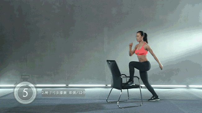 ▲椅子弓步膝腿:左腳站在椅子上,右腿往上抬,呈90%後返回原處,一側做12個,然後換另一側也是12個。